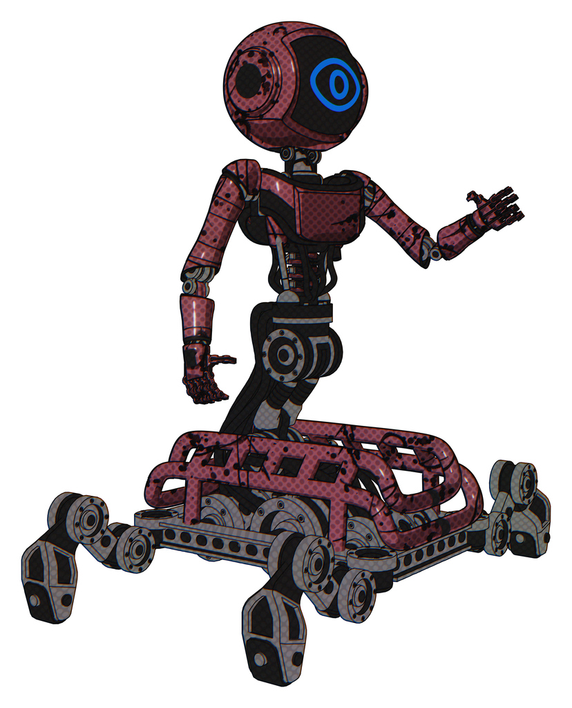 Robot containing digital display head and large eye and light chest exoshielding and ultralight chest exosuit and insect walker legs. Muavewood halftone grunge. Interacting.