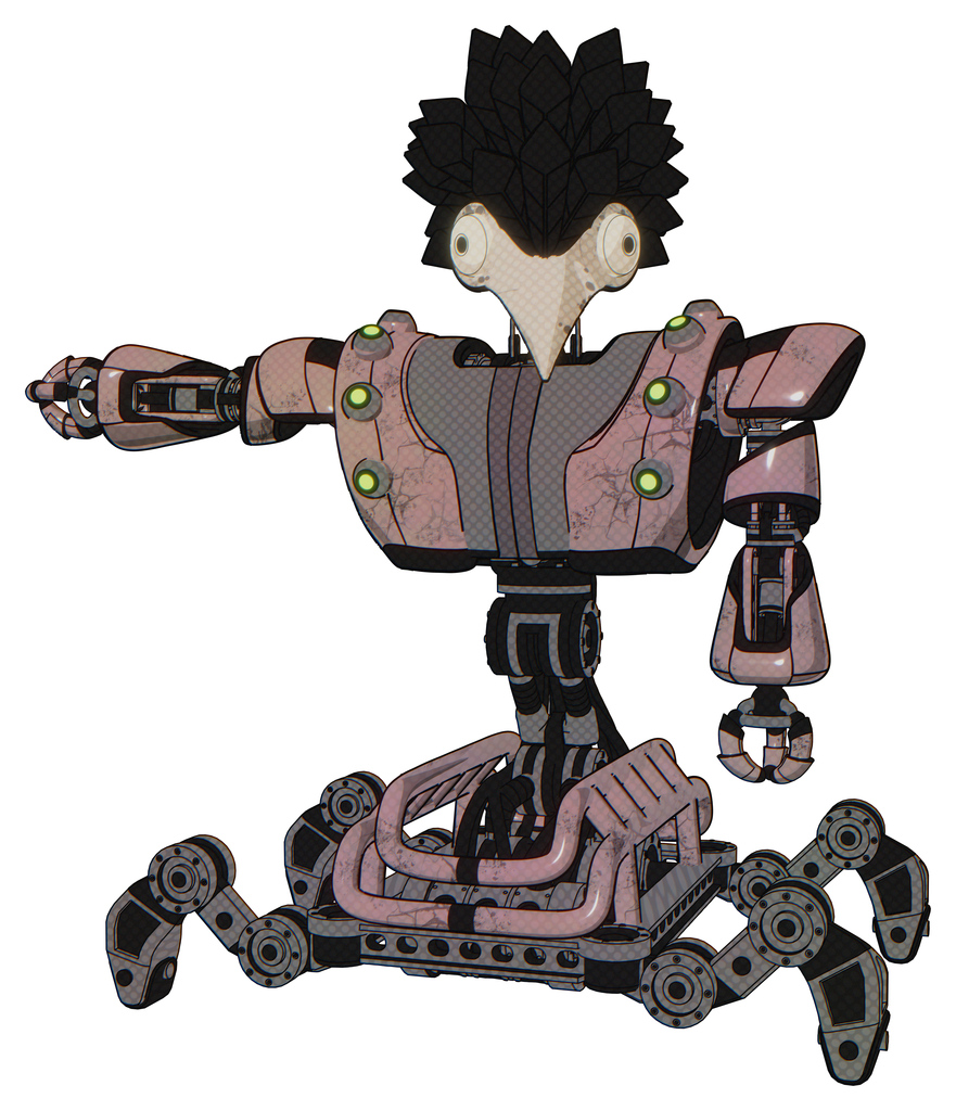 Bot containing bird skull head and bone skull eye holes and crow feather design and heavy upper chest and heavy mech chest and green cable sockets array and insect walker legs. Powder pink metal.