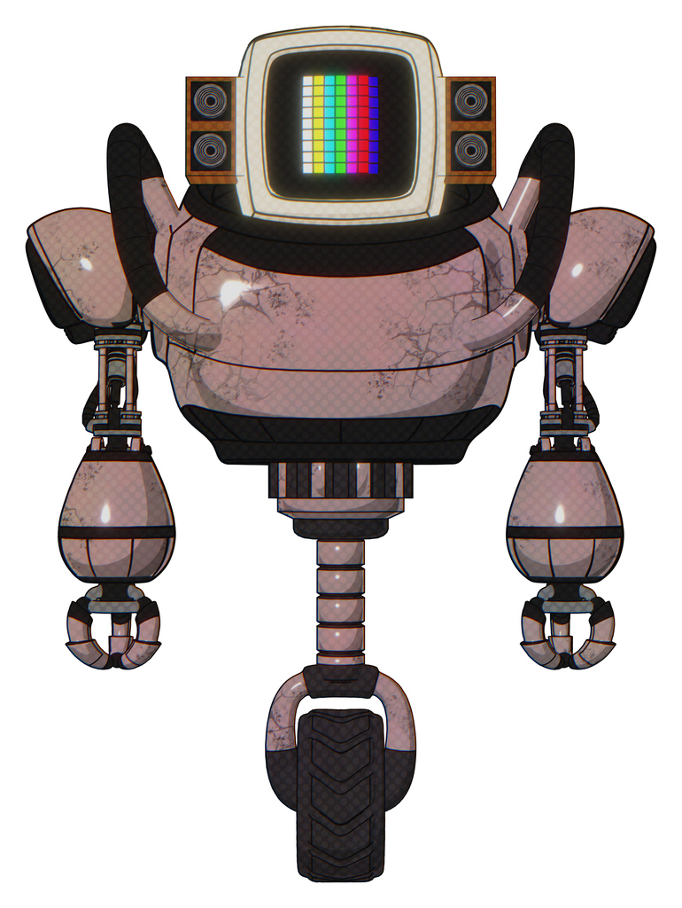 Automaton containing old computer monitor and please stand by pixel design and old retro speakers and heavy upper chest and unicycle wheel. Powder pink metal. Front view.