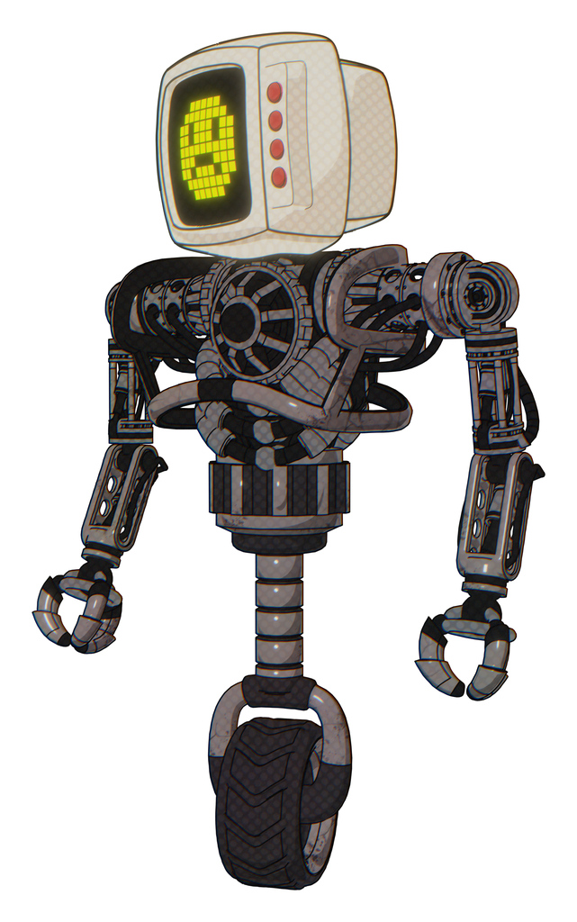 Droid containing old computer monitor and yellow sad pixel face and red buttons and heavy upper chest and no chest plating and unicycle wheel. Light pink beige. Standing looking right restful pose.