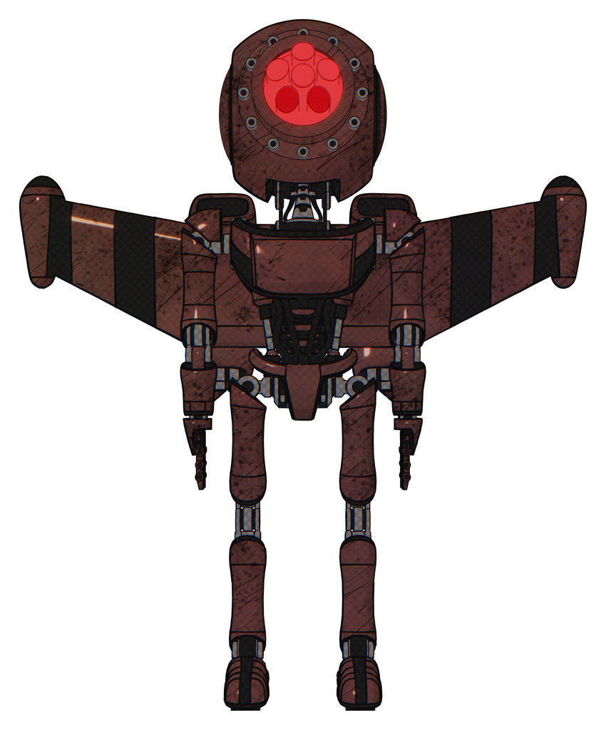 Droid containing round head and red laser crystal array and light chest exoshielding and ultralight chest exosuit and stellar jet wing rocket pack and ultralight foot exosuit. Steampunk copper.