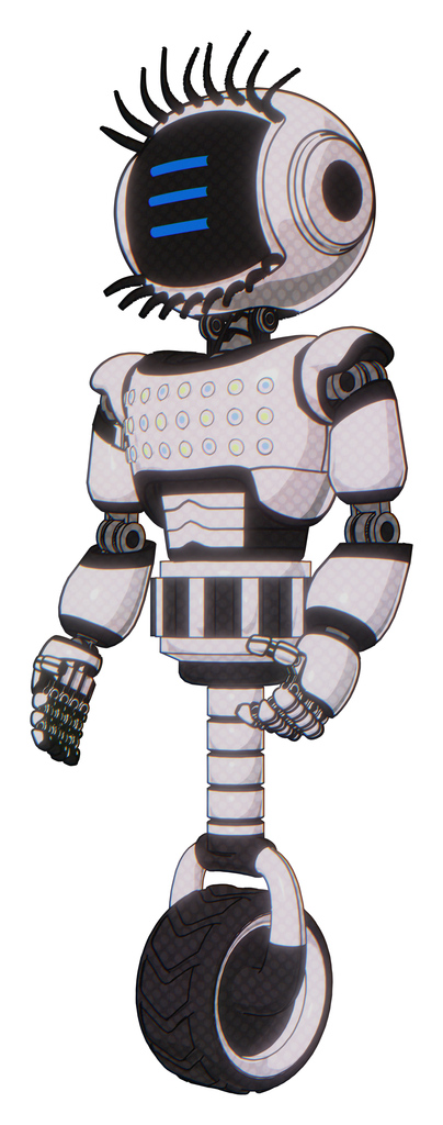 Mech containing elements: digital display head, three horizontal line design, eye lashes deco, light chest exoshielding, chest green blue lights array, unicycle wheel. Material: White halftone toon.