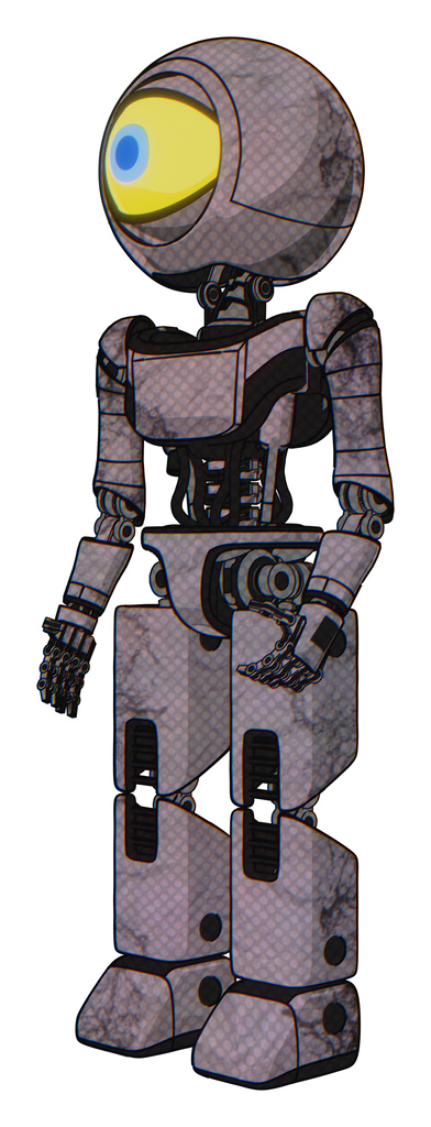 Droid containing giant eyeball head design and light chest exoshielding and ultralight chest exosuit and prototype exoplate legs. Dark dirty scrawl sketch. Facing right view.