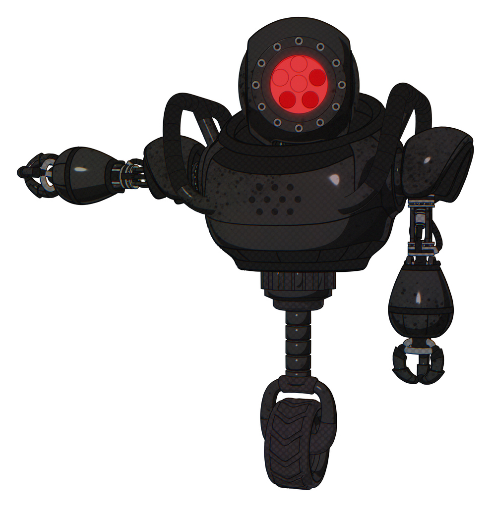Droid containing round head and red laser crystal array and heavy upper chest and unicycle wheel. Dirty black. Arm out holding invisible object..
