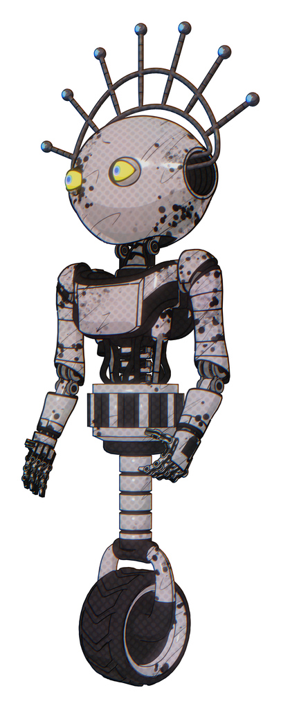 Automaton containing oval wide head and yellow eyes and techno halo ornament and light chest exoshielding and ultralight chest exosuit and unicycle wheel. Grunge sketch dots. Facing right view.