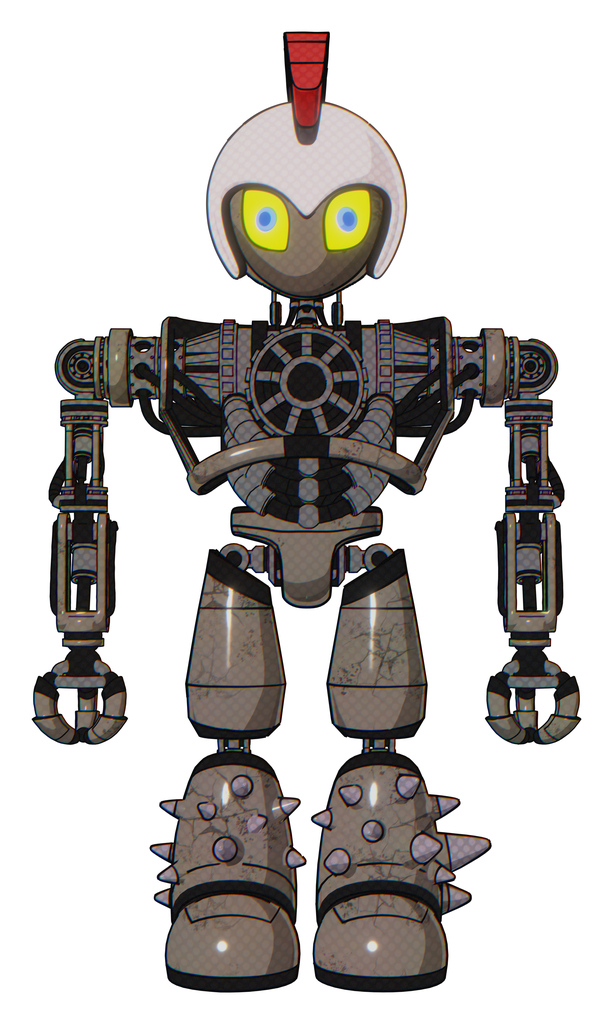 Bot containing elements: grey alien style head, yellow eyes with blue pupils, galea roman soldier ornament, helmet, heavy upper chest, no chest plating, light leg exoshielding, spike foot mod.