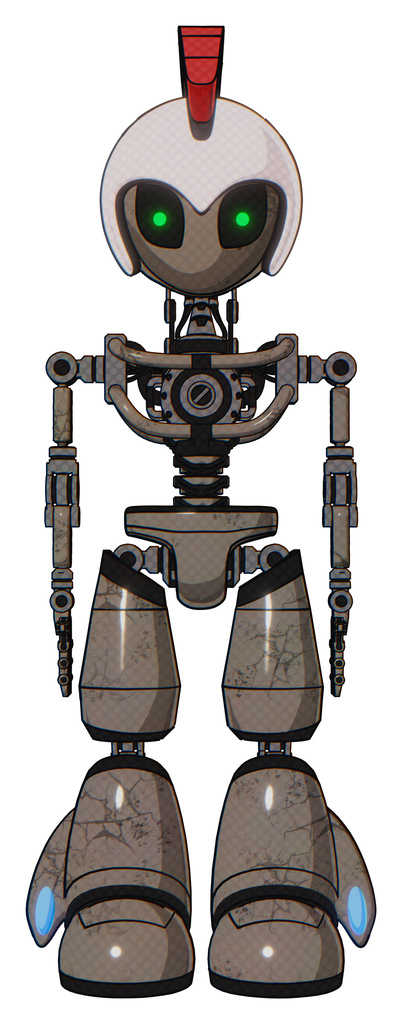 Mech containing elements: grey alien style head, green inset eyes, galea roman soldier ornament, helmet, light chest exoshielding, no chest plating, light leg exoshielding.