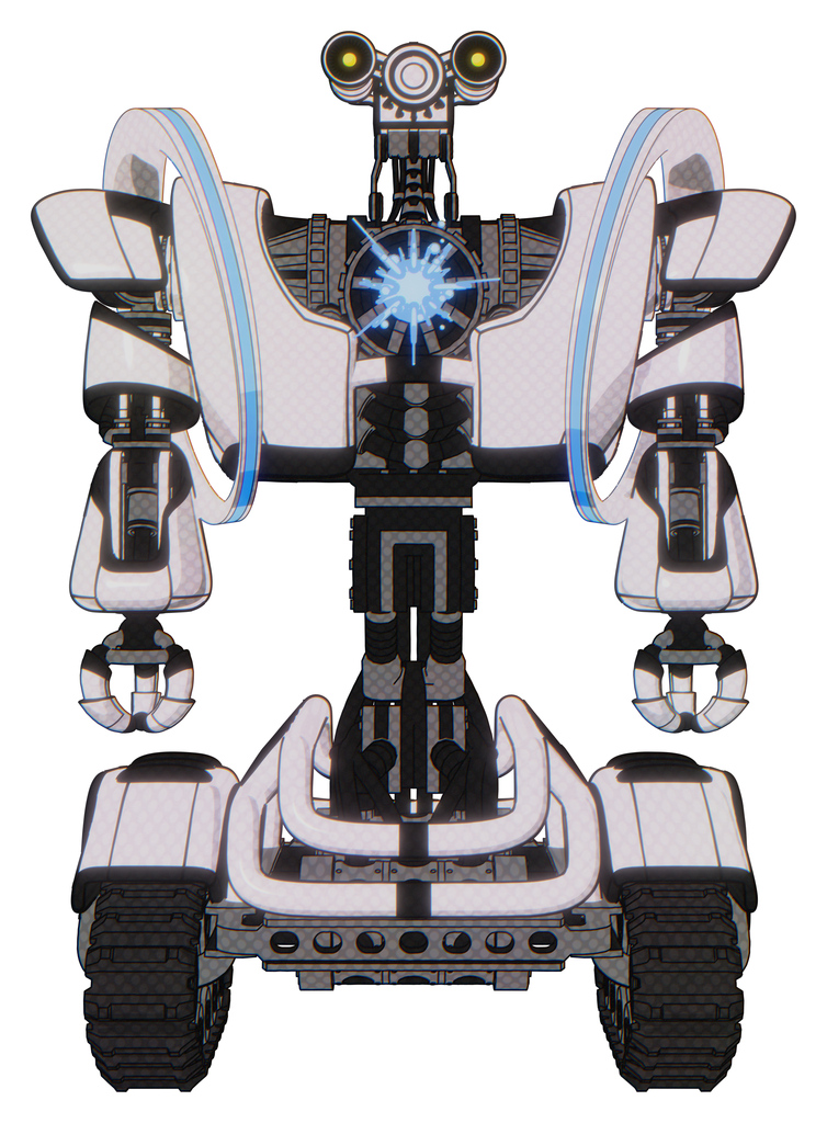 Mech containing dual retro camera head and simple blue telescopic eye head and heavy upper chest and heavy mech chest and spectrum fusion core chest and tank tracks. White halftone toon. Front view.