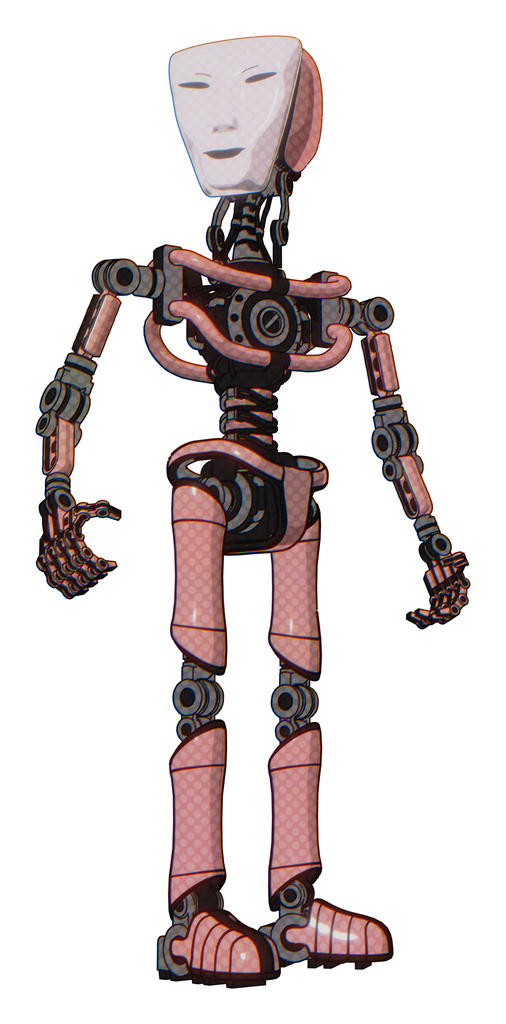 Droid containing humanoid face mask and light chest exoshielding and no chest plating and ultralight foot exosuit. Toon pink tint. Hero pose.