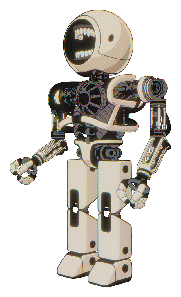 Automaton containing round head chomper design and heavy upper chest and no chest plating and prototype exoplate legs. Off white toon. Facing right view.