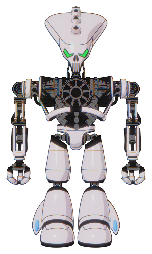Robot containing flat elongated skull head and heavy upper chest and no chest plating and light leg exoshielding. White halftone toon. Front view.