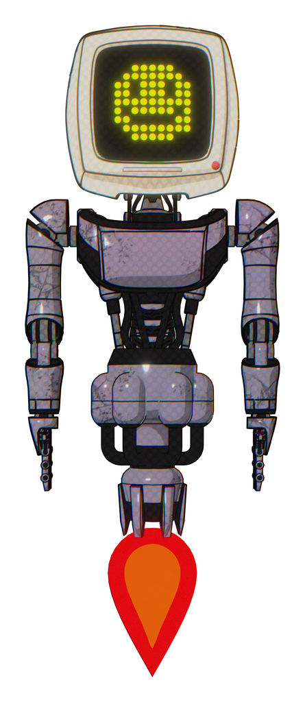 Robot containing old computer monitor and yellow happy face display and light chest exoshielding and ultralight chest exosuit and jet propulsion. Matted pink metal. Front view.
