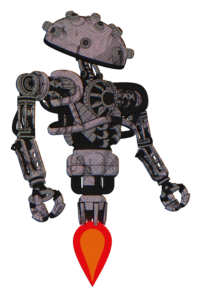 Bot containing plughead dome design and heavy upper chest and no chest plating and jet propulsion. Dark sketch random doodle. Facing left view.