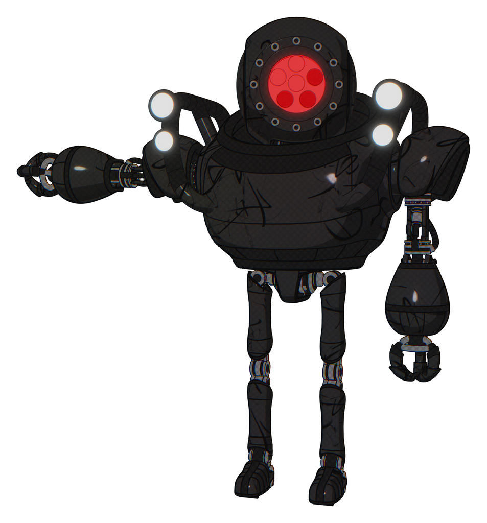 Bot containing round head and red laser crystal array and heavy upper chest and shoulder headlights and ultralight foot exosuit. Toon black scribbles sketch. Arm out holding invisible object..