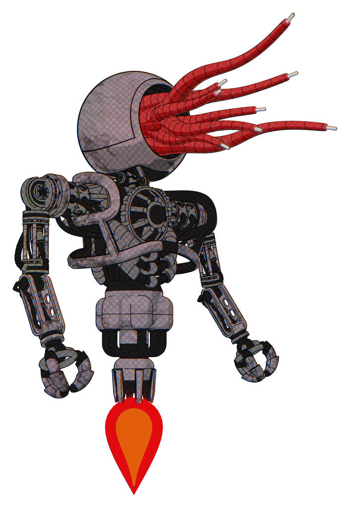 Automaton containing bright red jellyfish tentacles fiber optic design and heavy upper chest and no chest plating and jet propulsion. Dark dirty scrawl sketch. Facing left view.