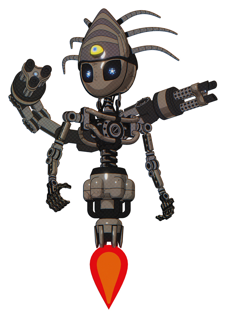 Mech containing grey alien style head and electric eyes and eyeball creature crown and light chest exoshielding and minigun back assembly and no chest plating and jet propulsion. Patent khaki metal.