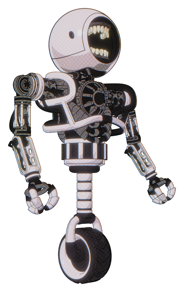 Bot containing round head chomper design and heavy upper chest and no chest plating and unicycle wheel. White halftone toon. Facing left view.
