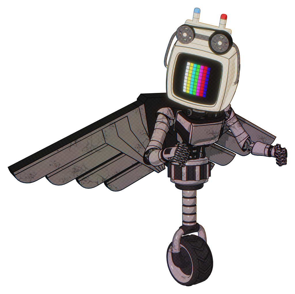 Bot containing elements: old computer monitor, please stand by pixel design, old computer magnetic tape, light chest exoshielding, ultralight chest exosuit, pilot's wings assembly, unicycle wheel.