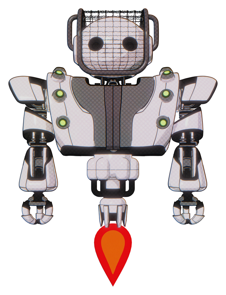 Robot containing oval wide head and barbed wire visor helmet and heavy upper chest and heavy mech chest and green cable sockets array and jet propulsion. White halftone toon. Front view.