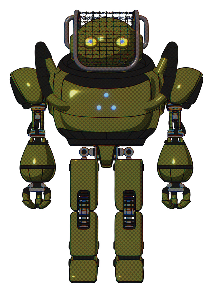 Bot containing oval wide head and yellow eyes and barbed wire visor helmet and heavy upper chest and triangle of blue leds and prototype exoplate legs. Army green halftone. Front view.
