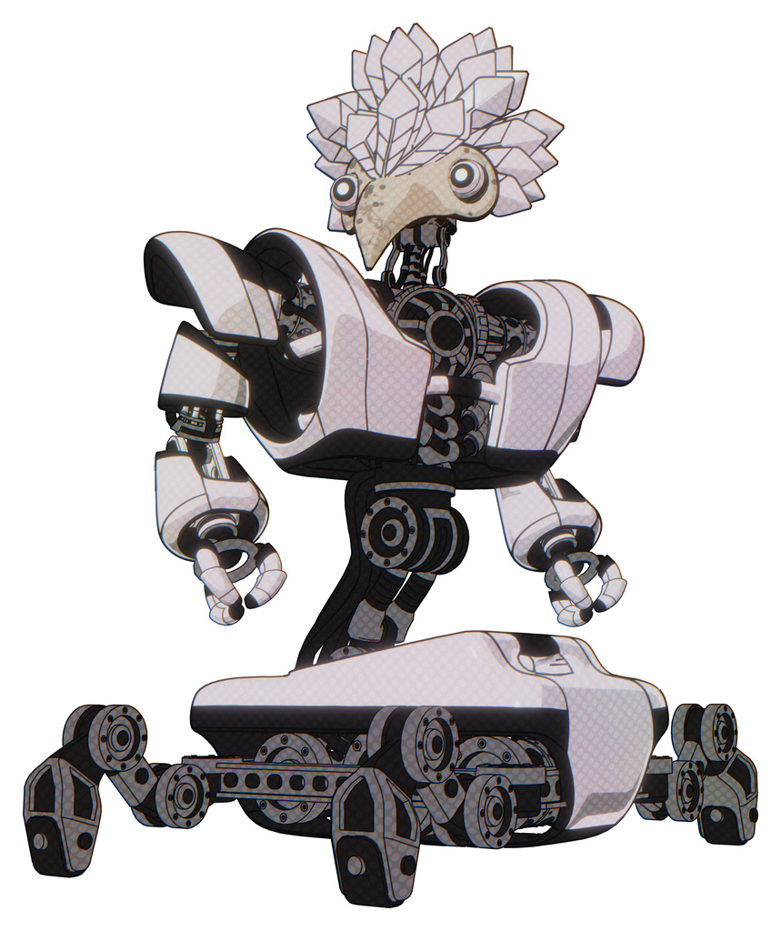 Mech containing bird skull head and white eyeballs and bird feather design and heavy upper chest and heavy mech chest and insect walker legs. White halftone toon. Hero pose.