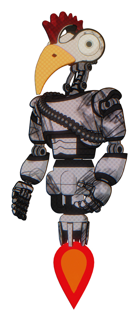 Bot containing bird skull head and bone skull eye holes and chicken design and light chest exoshielding and rubber chain sash and jet propulsion. Scribble sketch. Facing right view.