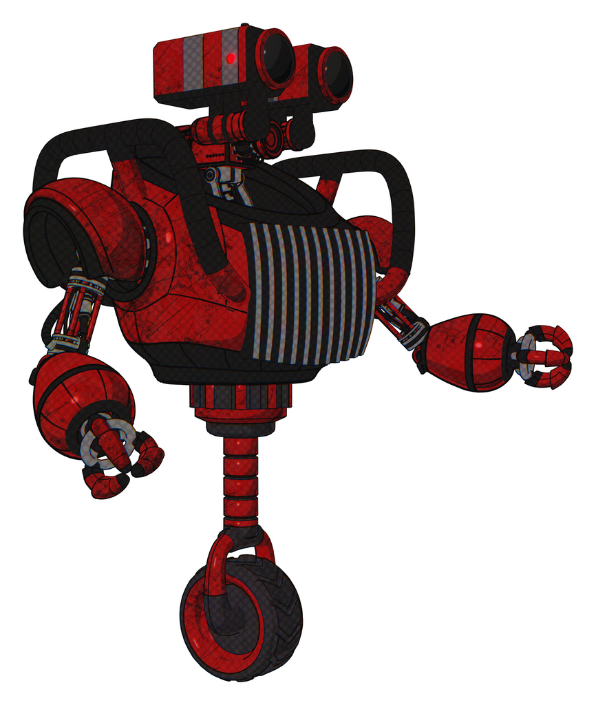 Robot containing dual retro camera head and heavy upper chest and chest vents and unicycle wheel. Red blood grunge material. Interacting.