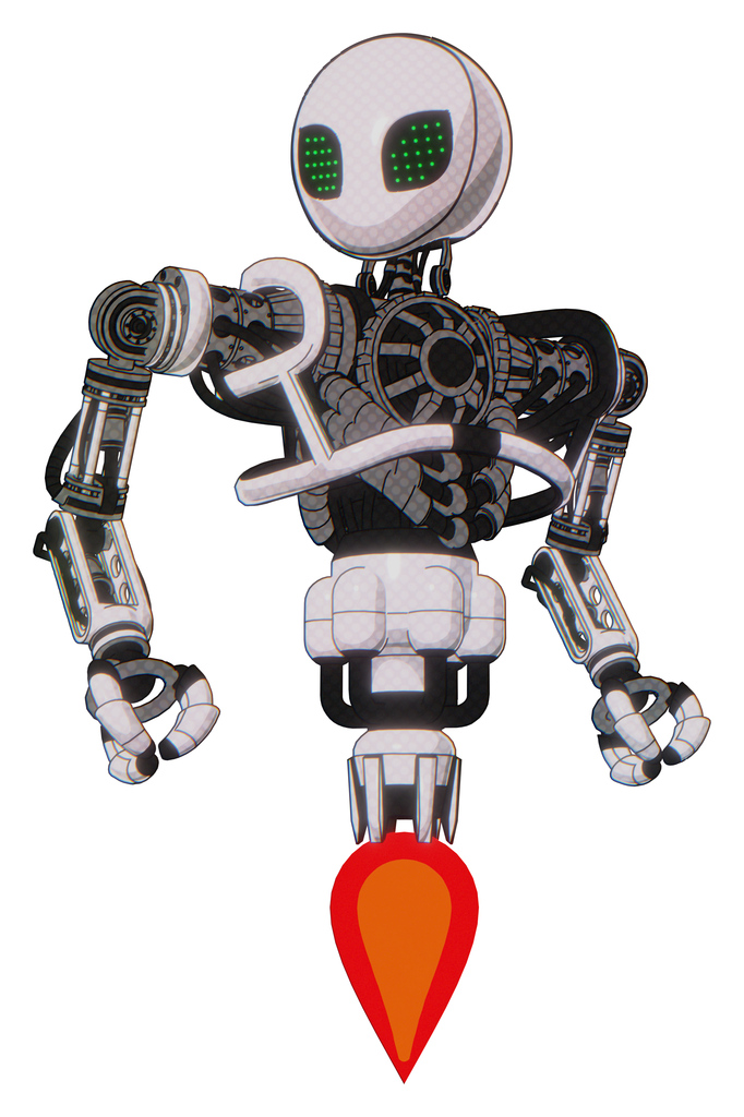 Bot containing grey alien style head and led array eyes and heavy upper chest and no chest plating and jet propulsion. White halftone toon. Hero pose.