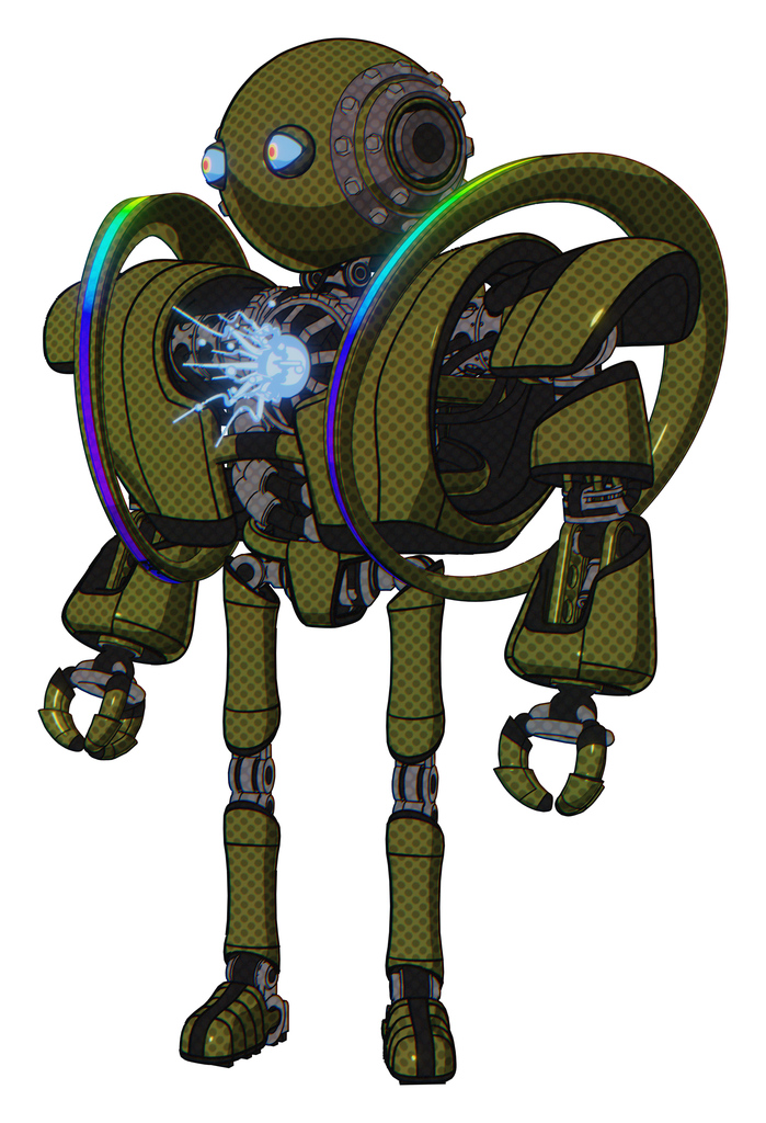 Robot containing oval wide head and blue eyes and steampunk iron bands with bolts and heavy upper chest and heavy mech chest and spectrum fusion core chest and ultralight foot exosuit.