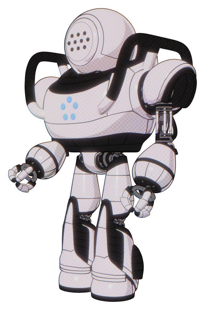 Bot containing dots array face and heavy upper chest and circle of blue leds and light leg exoshielding and stomper foot mod. White halftone toon. Facing right view.