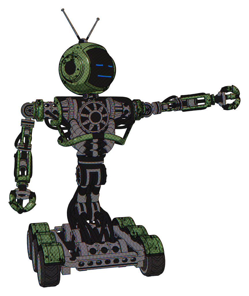 Cyborg containing digital display head and sleeping face and retro antennas and heavy upper chest and no chest plating and six-wheeler base. Grunge grass green. Pointing left or pushing a button..