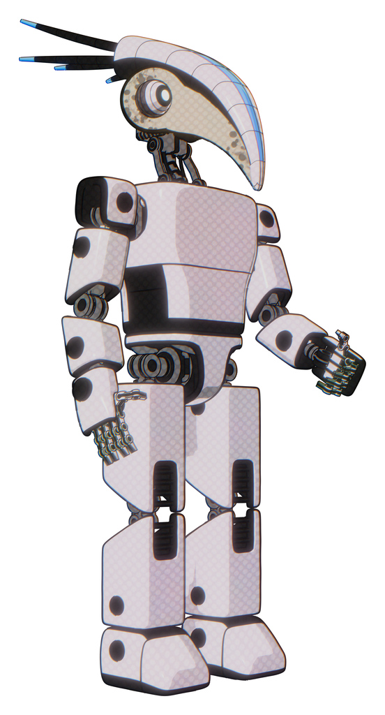 Mech containing bird skull head and white eyeballs and head shield design and light chest exoshielding and prototype exoplate chest and prototype exoplate legs. White halftone toon. Facing left view.