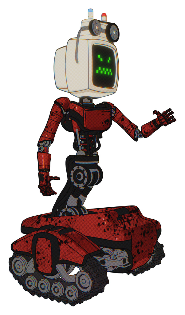 Automaton containing old computer monitor and angry pixels face and old computer magnetic tape and light chest exoshielding and ultralight chest exosuit and tank tracks. Grunge dots cherry tomato red.