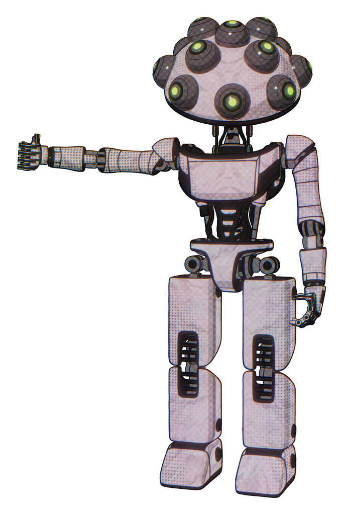 Bot containing many robo-eye domehead design and light chest exoshielding and ultralight chest exosuit and prototype exoplate legs. Sketch pad dots pattern. Arm out holding invisible object..