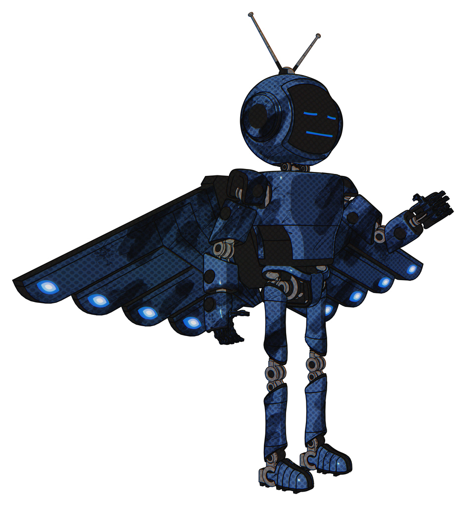 Bot containing elements: digital display head, sleeping face, retro antennas, light chest exoshielding, prototype exoplate chest, cherub wings design, ultralight foot exosuit.