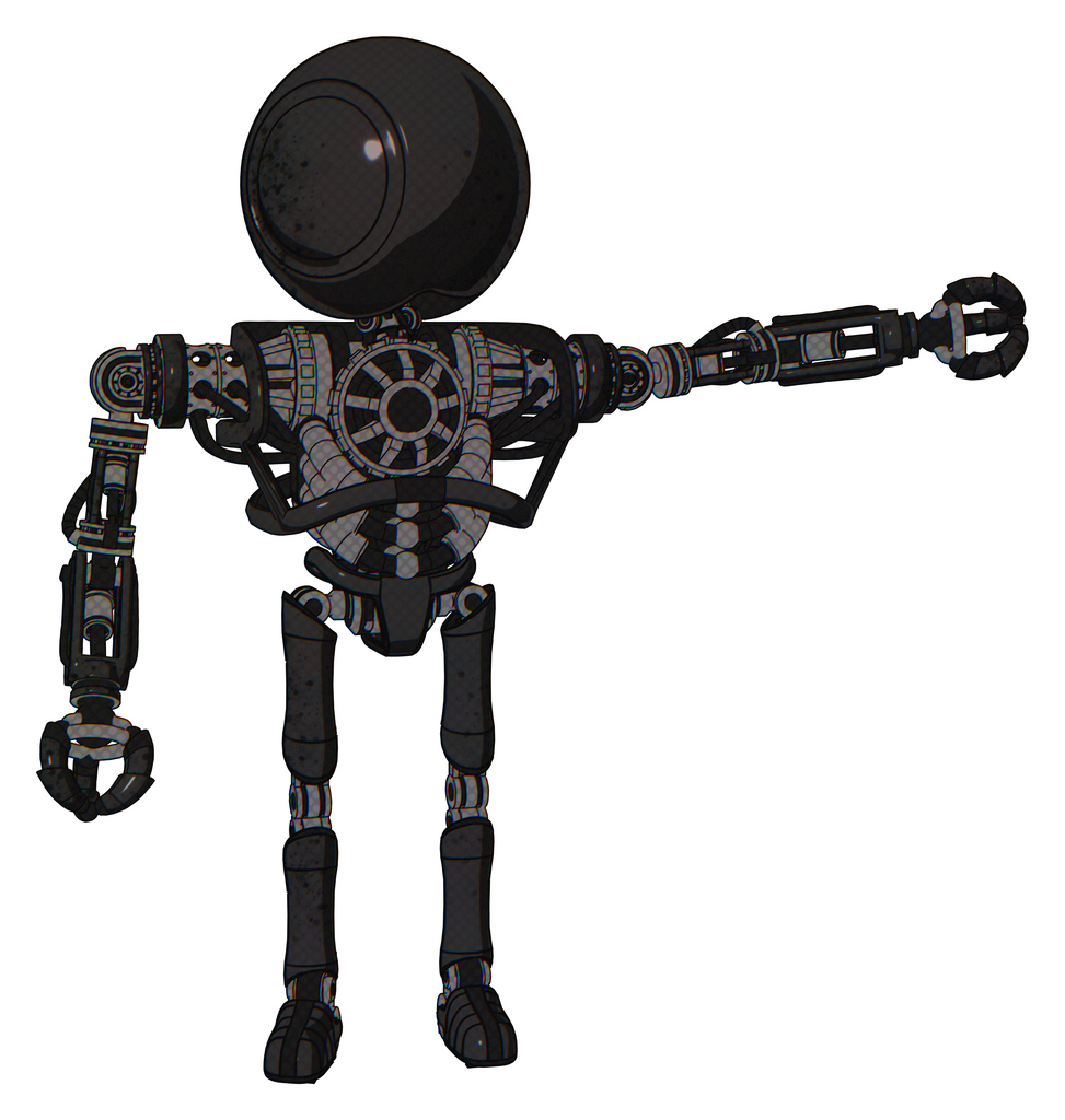 Droid containing round head and heavy upper chest and no chest plating and ultralight foot exosuit. Dirty black. Pointing left or pushing a button..
