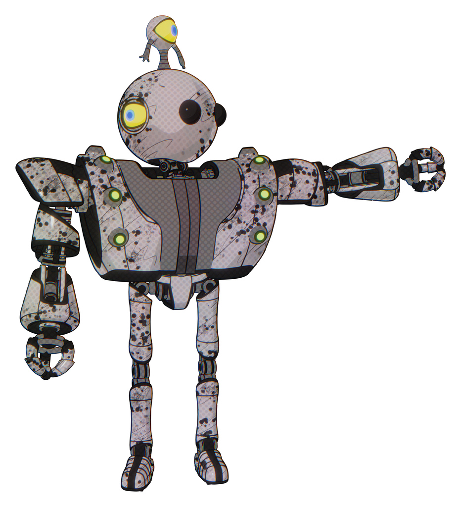 Cyborg containing oval wide head and beady black eyes and minibot ornament and heavy upper chest and heavy mech chest and green cable sockets array and ultralight foot exosuit. Grunge sketch dots.