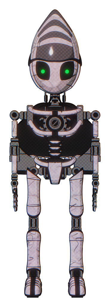 Bot containing grey alien style head and green inset eyes and light chest exoshielding and rocket pack and no chest plating and ultralight foot exosuit. Sketch pad doodle lines. Front view.