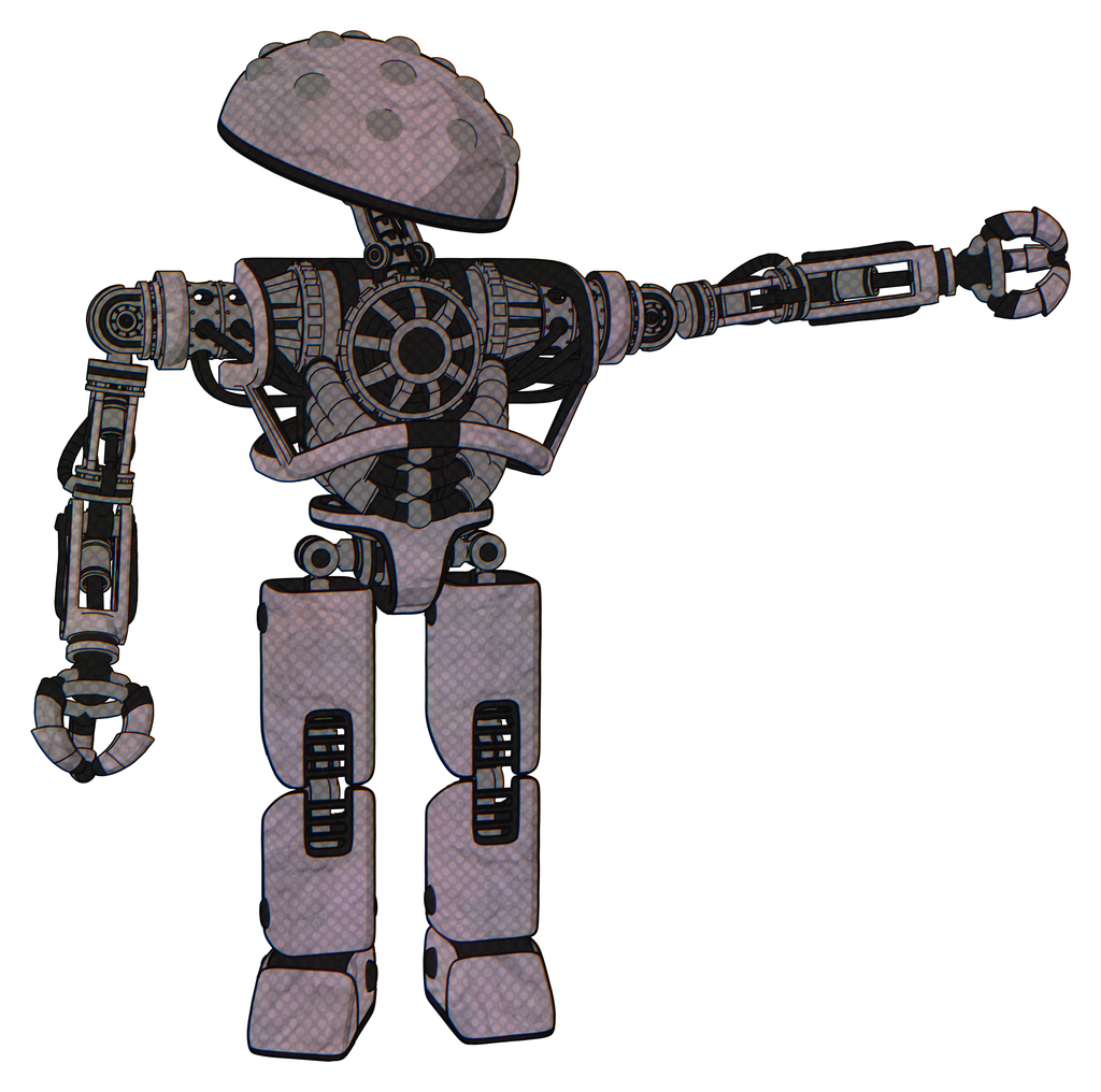 Robot containing metal knucklehead design and heavy upper chest and no chest plating and prototype exoplate legs. Dark sketch. Pointing left or pushing a button..