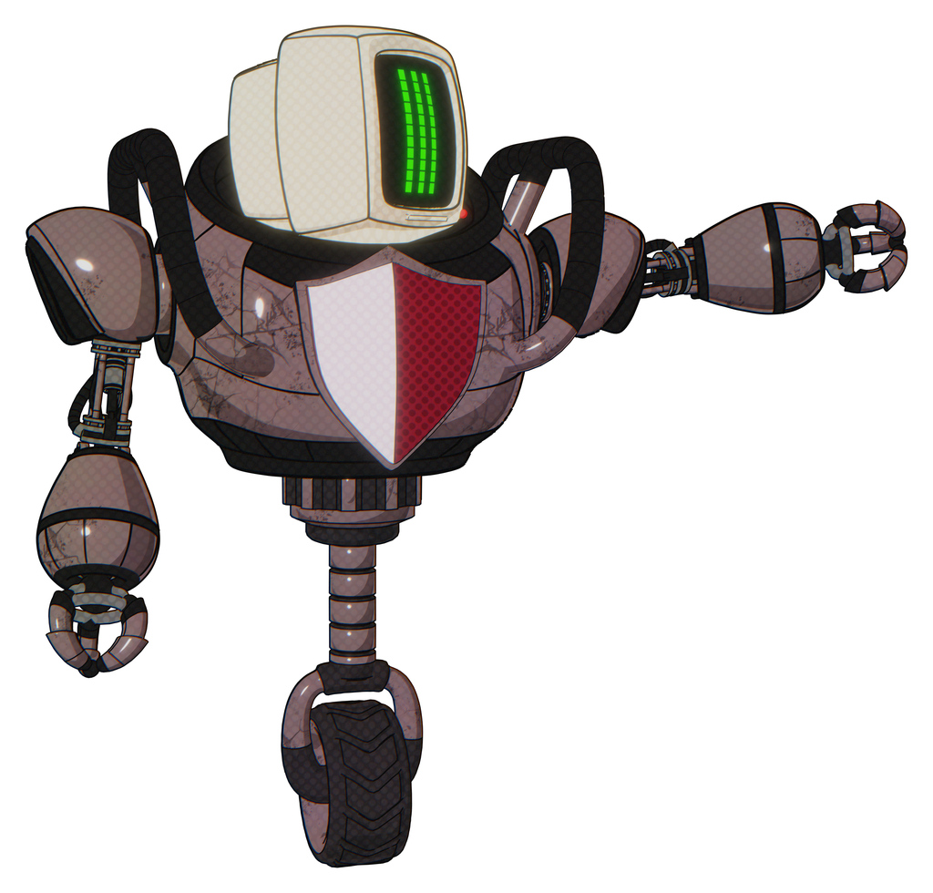 Bot containing old computer monitor and three lines pixel design and heavy upper chest and red shield defense design and unicycle wheel. Dusty rose red metal. Pointing left or pushing a button..