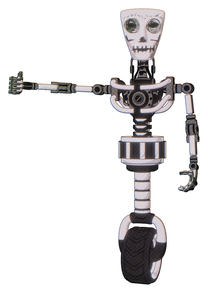Mech containing humanoid face mask and skeleton war paint and light chest exoshielding and no chest plating and unicycle wheel. White halftone toon. Arm out holding invisible object..