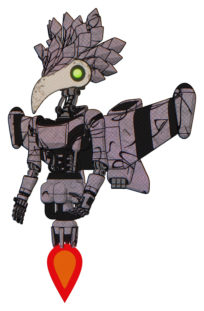 Automaton containing bird skull head and green eyes and bird feather design and light chest exoshielding and ultralight chest exosuit and stellar jet wing rocket pack and jet propulsion.