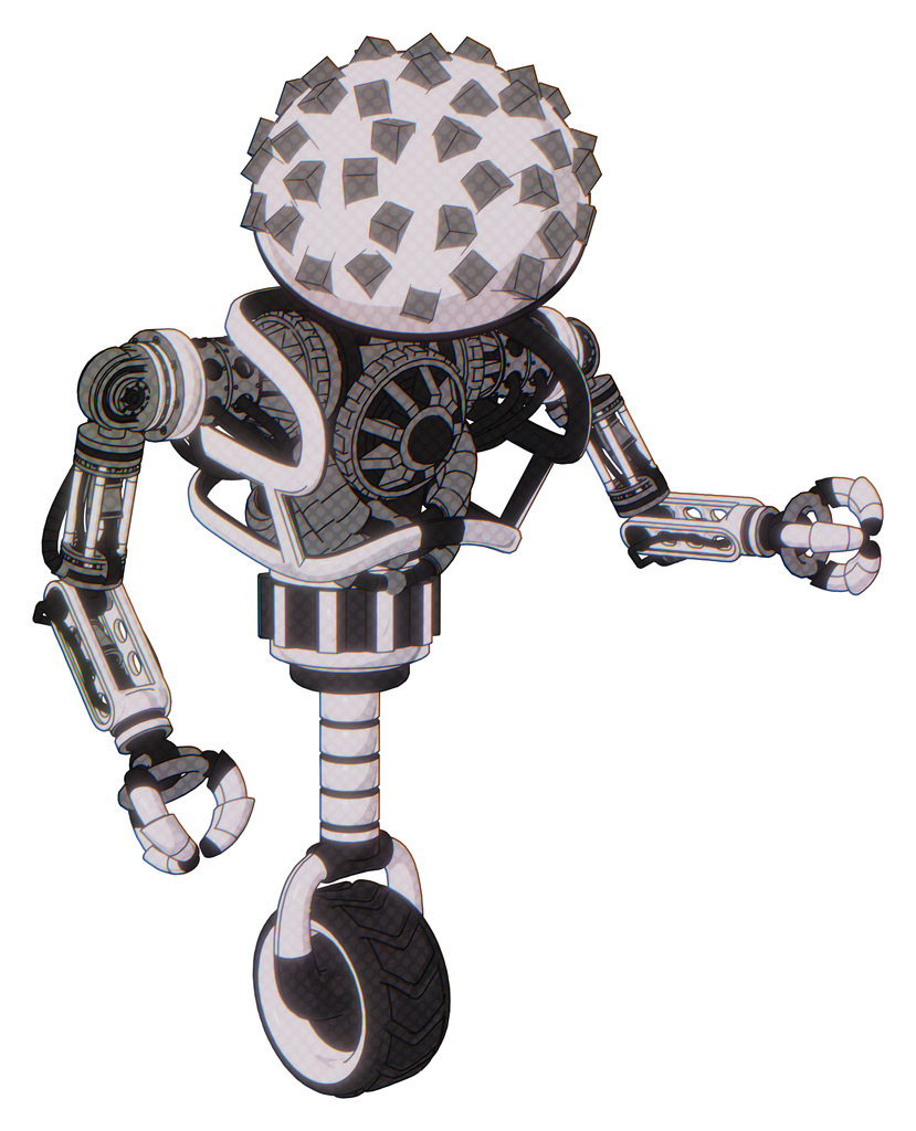 Automaton containing metal cubes dome head design and heavy upper chest and no chest plating and unicycle wheel. White halftone toon. Fight or defense pose..
