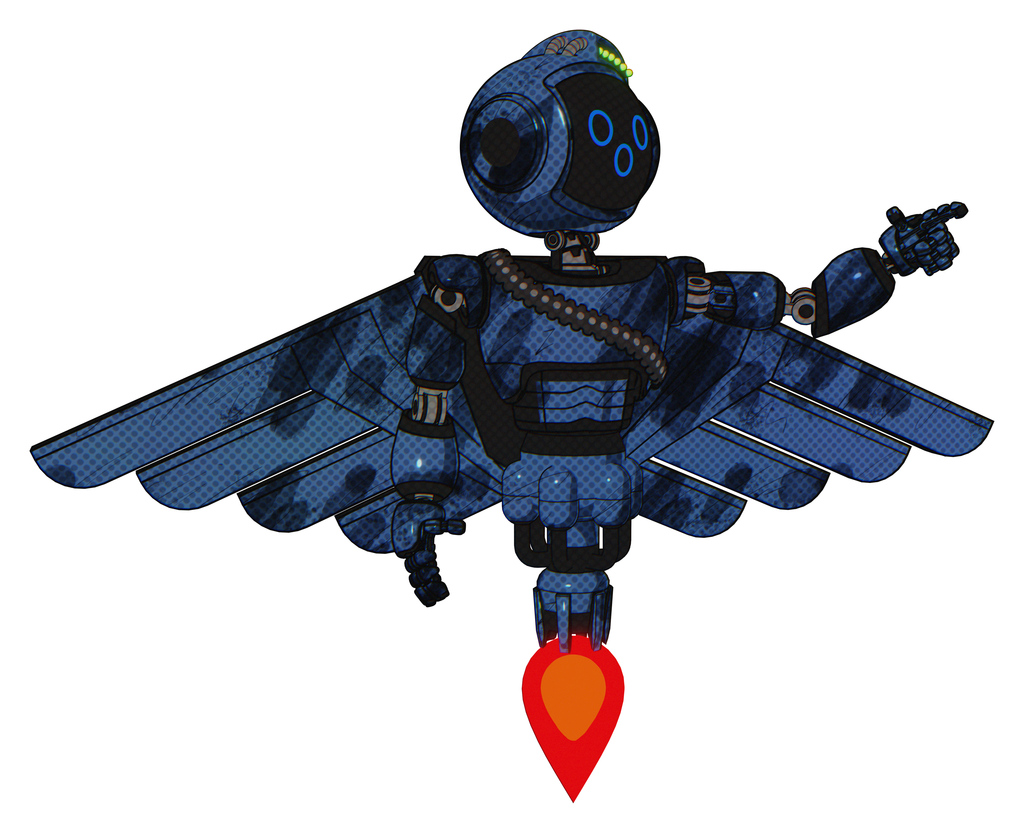 Cyborg containing digital display head and woo expression and green led array and light chest exoshielding and rubber chain sash and pilot's wings assembly and jet propulsion. Grunge dark blue.