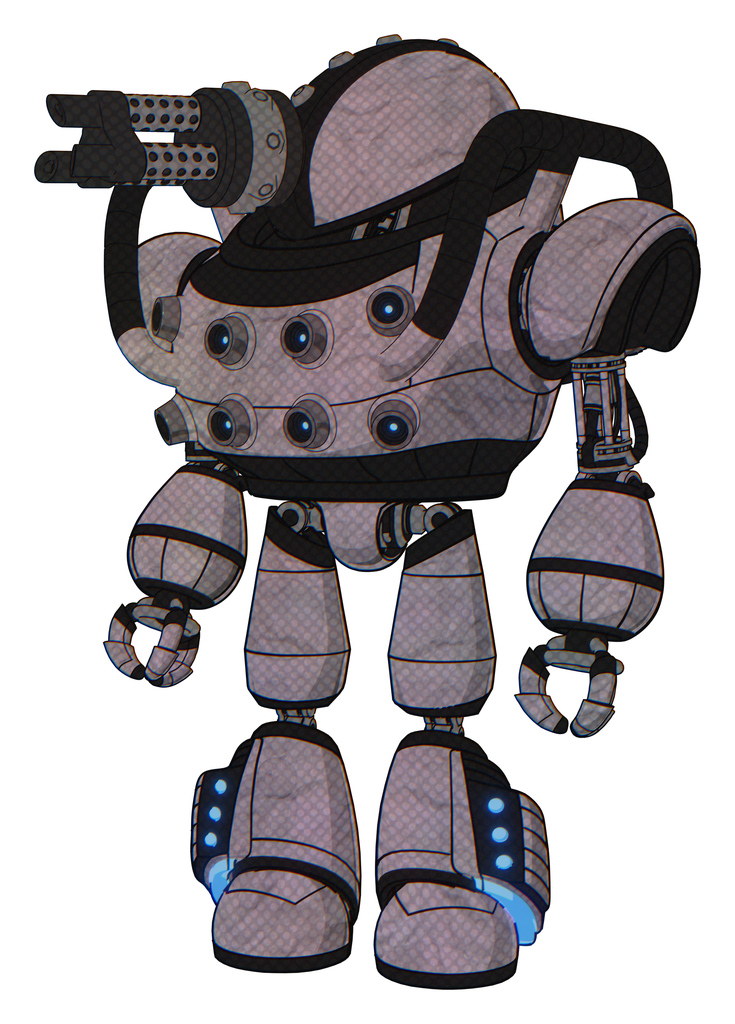 Bot containing gatling gun face design and heavy upper chest and chest energy sockets and light leg exoshielding and megneto-hovers foot mod. Dark sketch. Standing looking right restful pose.