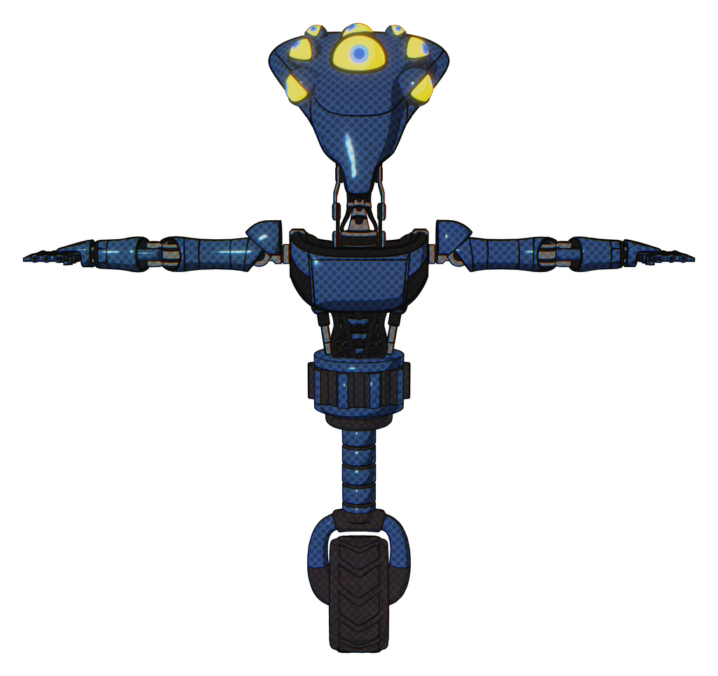 Robot containing flat elongated skull head and yellow eyeball array and light chest exoshielding and ultralight chest exosuit and unicycle wheel. Dark blue halftone. T-pose.