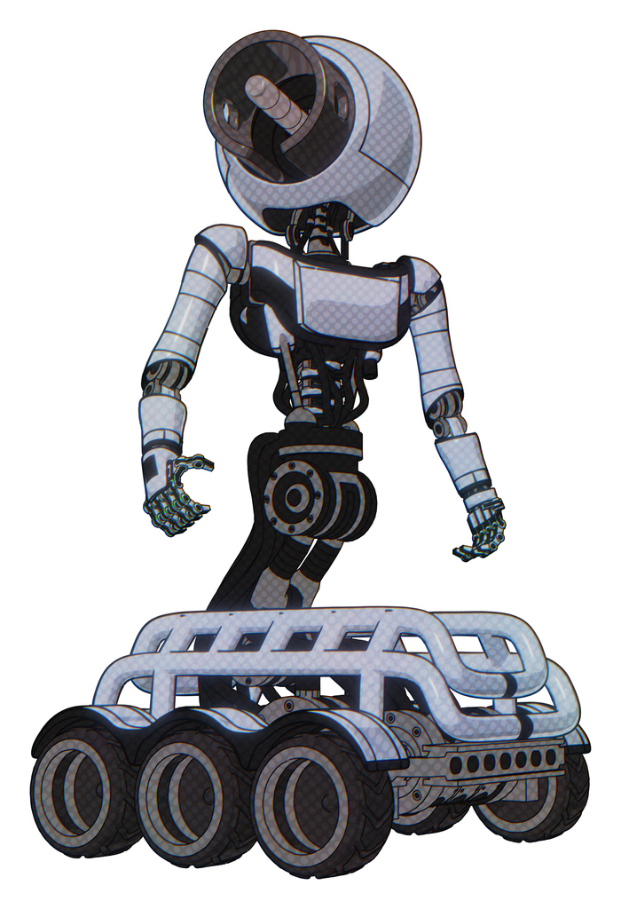Bot containing cable connector head and light chest exoshielding and ultralight chest exosuit and six-wheeler base. Blue tint toon. Hero pose.