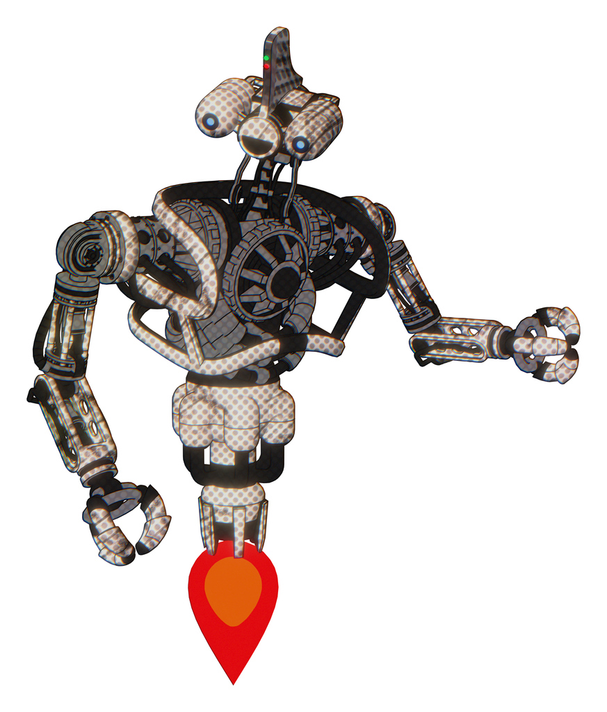 Droid containing dual retro camera head and reversed fin head and heavy upper chest and no chest plating and jet propulsion. Halftone sketch. Fight or defense pose..