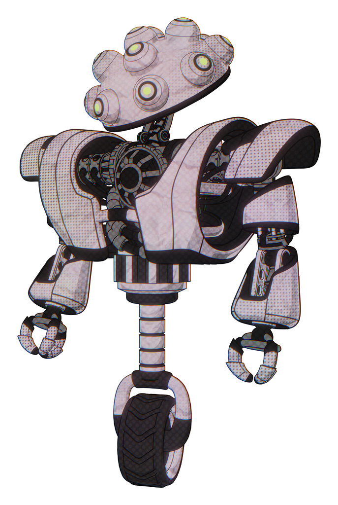 Automaton containing techno multi-eyed domehead design and heavy upper chest and heavy mech chest and unicycle wheel. Sketch pad dots pattern. Standing looking right restful pose.
