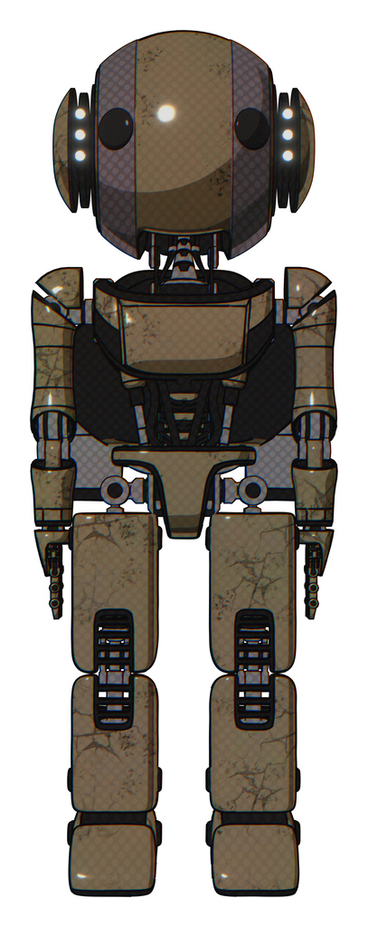 Bot containing round head and maru eyes and head light gadgets and light chest exoshielding and ultralight chest exosuit and rocket pack and prototype exoplate legs. Desert tan painted. Front view.